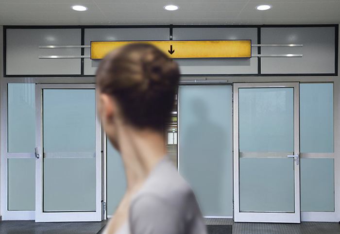 Exit is an interactive video installation including the visitor. The projection shows a closed glass sliding door. A video camera, barely visible above the projection, films the viewer in front of the projection and feeds these live video images of the exhibition area into the glass panes of the projection as a virtual mirror image. Simoultaneously the observer approaches the projection, the glass sliding door within the video opens and allows a view of the other side of the passageway.